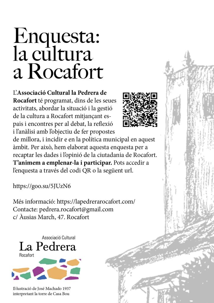 L’Associació Cultural la Pedrera de Rocafort té programat, dins de les seues activitats, abordar la situació i la gestió de la cultura a Rocafort mitjançant espais i encontres per al debat, la reflexió i l’anàlisi amb l’objectiu de fer propostes de millora, i incidir e en la política municipal en aquest àmbit. Per això, hem elaborat aquesta enquesta per a recaptar les dades i l’opinió de la ciutadania de Rocafort. T’animem a emplenar-la i participar.