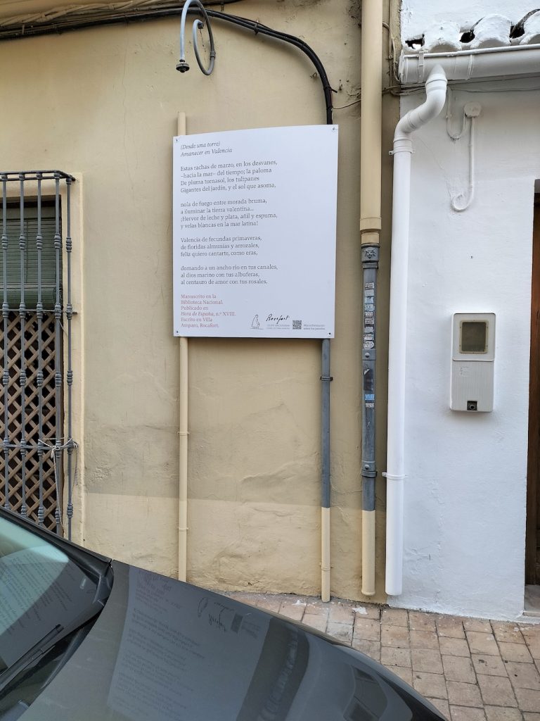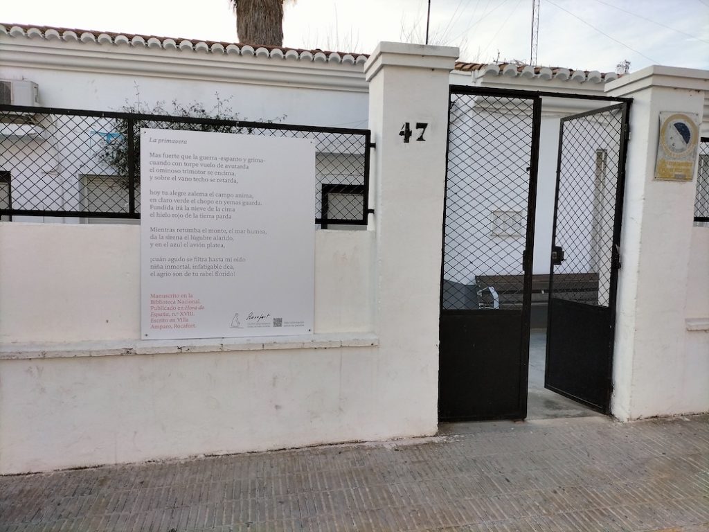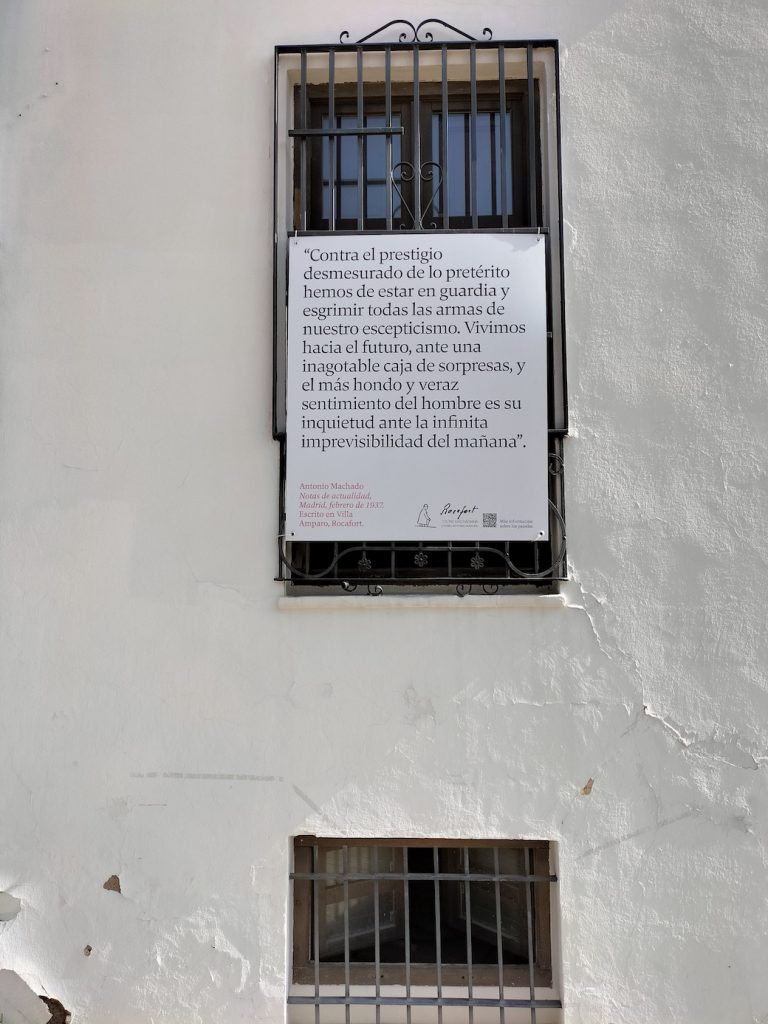 Actividad realizada en el contexto de los actos del 84 aniversario de la muerte del poeta en Colliure, que consiste en la colocación, a modo de ruta o paseo por Rocafort, de una serie de 15 paneles en los que se recoge una selección de textos y poemas de entre los que Machado escribió en Rocafort. Los paneles incluyen un enlace, mediante un código qr, a través del cual se puede acceder a más información sobre la ruta y a un contenido que se irá enriqueciendo con la participación de los viandantes.