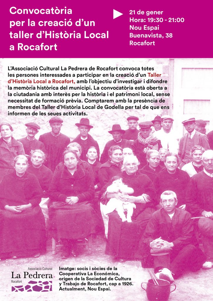 L’Associació Cultural La Pedrera de Rocafort va convocar totes les persones interessades a participar en la creació d’un Taller d’Història Local a Rocafort, amb l’objectiu d’investigar i difondre la memòria històrica del municipi. La convocatòria va estar oberta a la ciutadania amb interès per la història i el patrimoni local, sense necessitat de formació prèvia. Vam comptar amb la presència de membres del Taller d’Història Local de Godella per tal que ens informaren de les seues activitats.