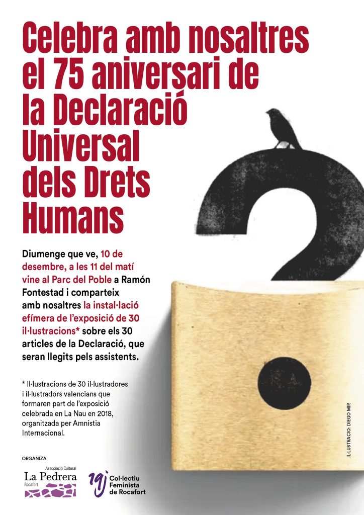 El pasado domingo, 10 de diciembre, a las 11 de la mañana, en el Parc del Poble a Ramón Fontestad recordamos la importancia de los Derechos Humanos con la instalación efímera de la exposición de 30 ilustraciones sobre los 30 artículos de la Declaración, que fueron leídos por los asistentes.