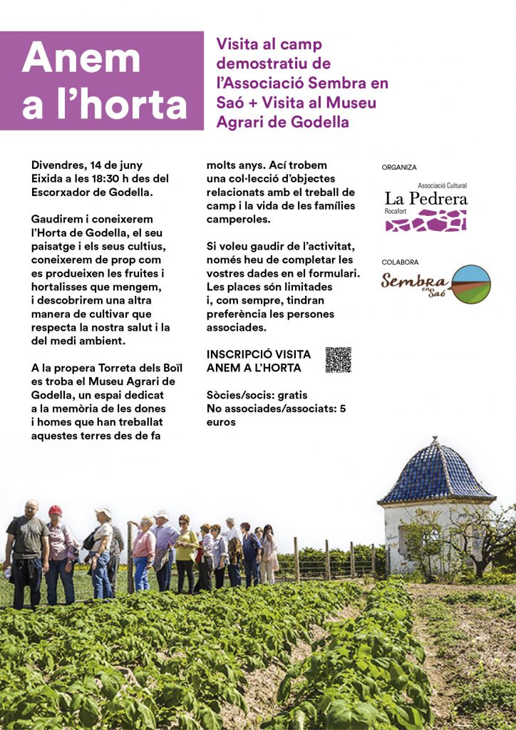 Gaudirem i coneixerem l’Horta de Godella, el seu paisatge i els seus cultius, coneixerem de prop com es produeixen les fruites i hortalisses que mengem, i descobrirem una altra manera de cultivar que respecta la nostra salut i la del medi ambient.